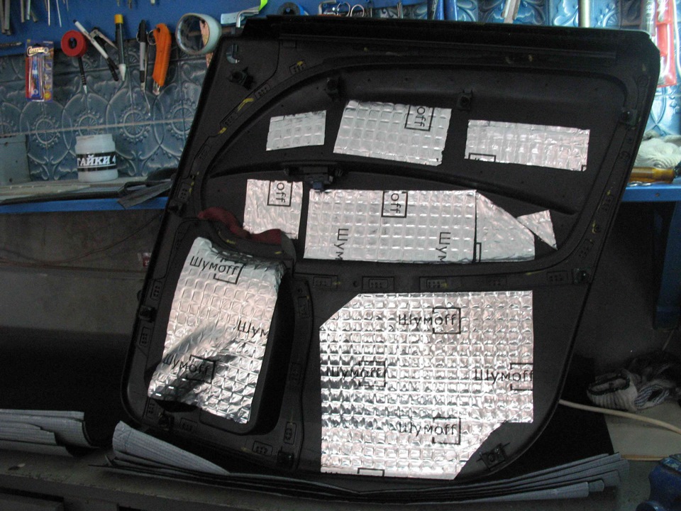 — Дверная карта обрабатывается кусками вибры, чтобы избавиться от вибраций и дребезга. А под неё приклеивается максимально толстый шумопоглотитель, какой только поместится (например, герметон А15, А30).
