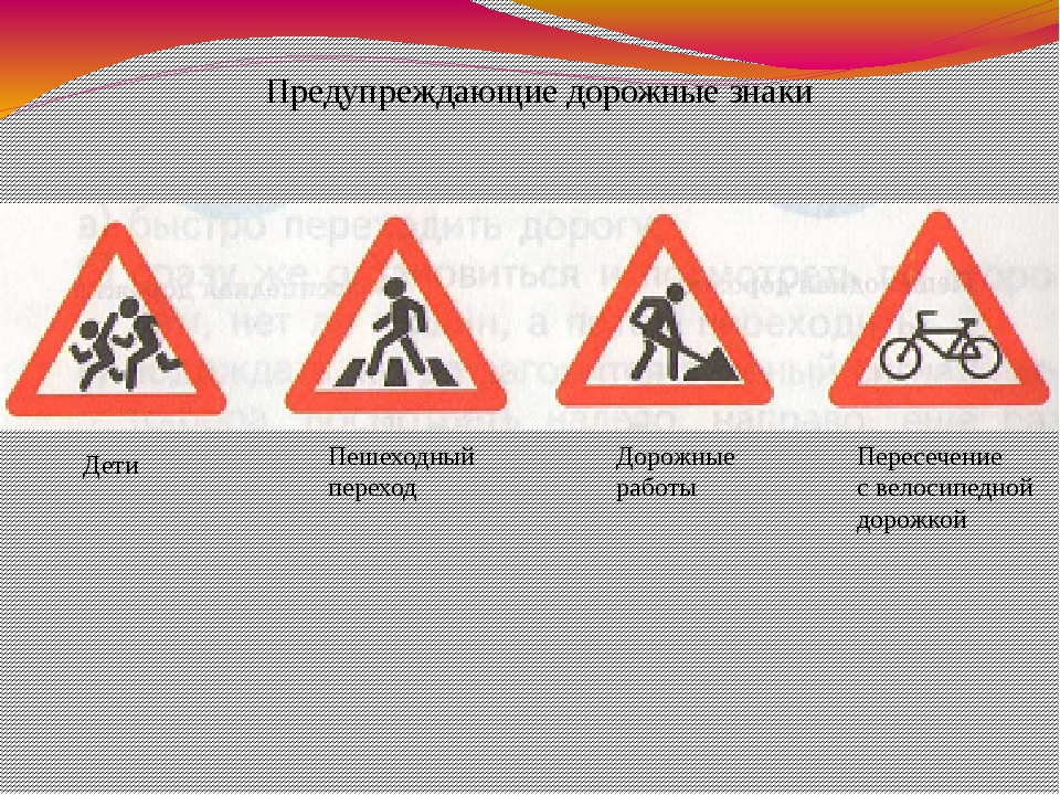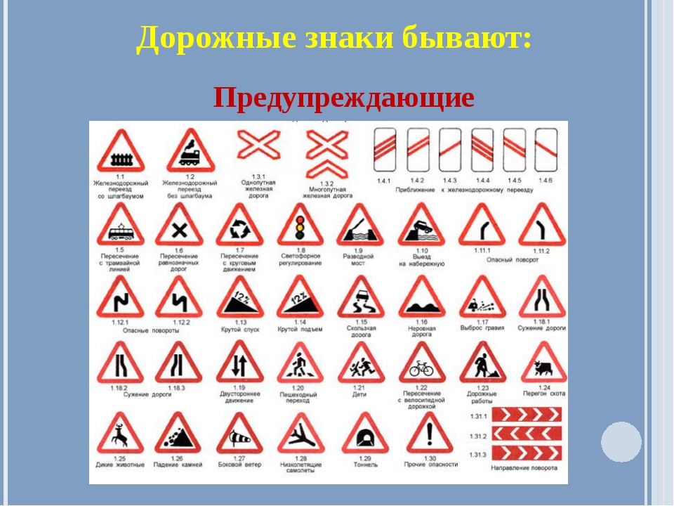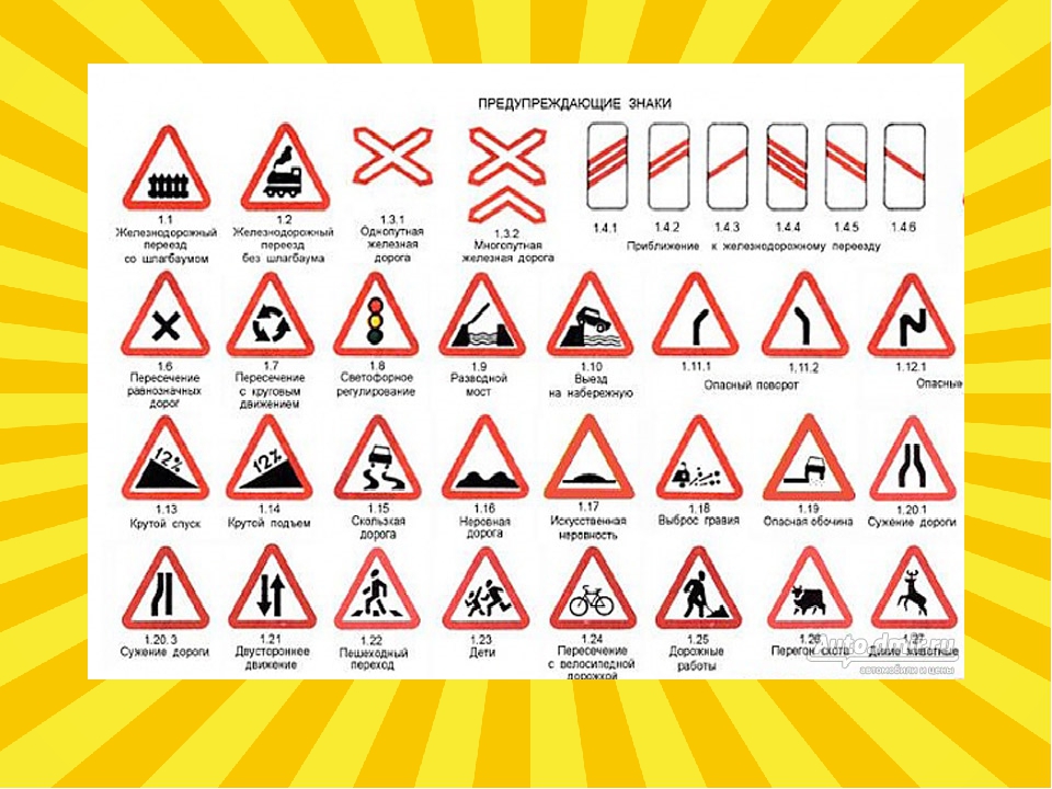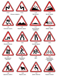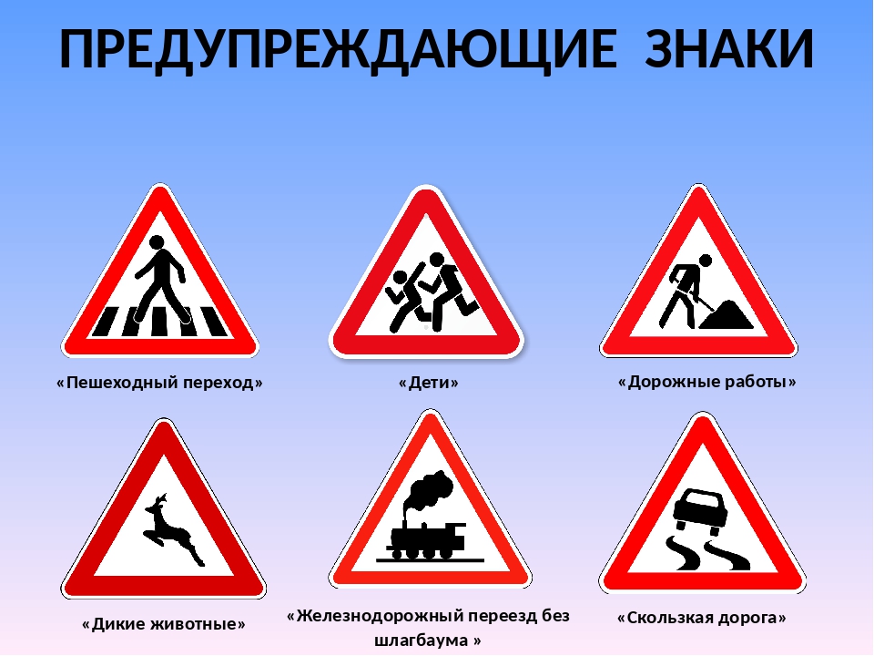 | Предупреждающие | Предупреждают об опасном участке дороги | Красный треугольник с картинкой внутри на белом фоне | «Ж/Д переезд», «Тоннель», «Дети», «Опасный поворот», «Сужение дороги» |