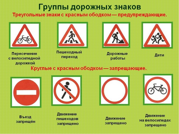 Дорожные знаки разбиты на 8 групп. Каждая группа преследует свои цели — предупредить водителя об опасности, обозначить какой-то запрет, указать правильное направление движения и пр.