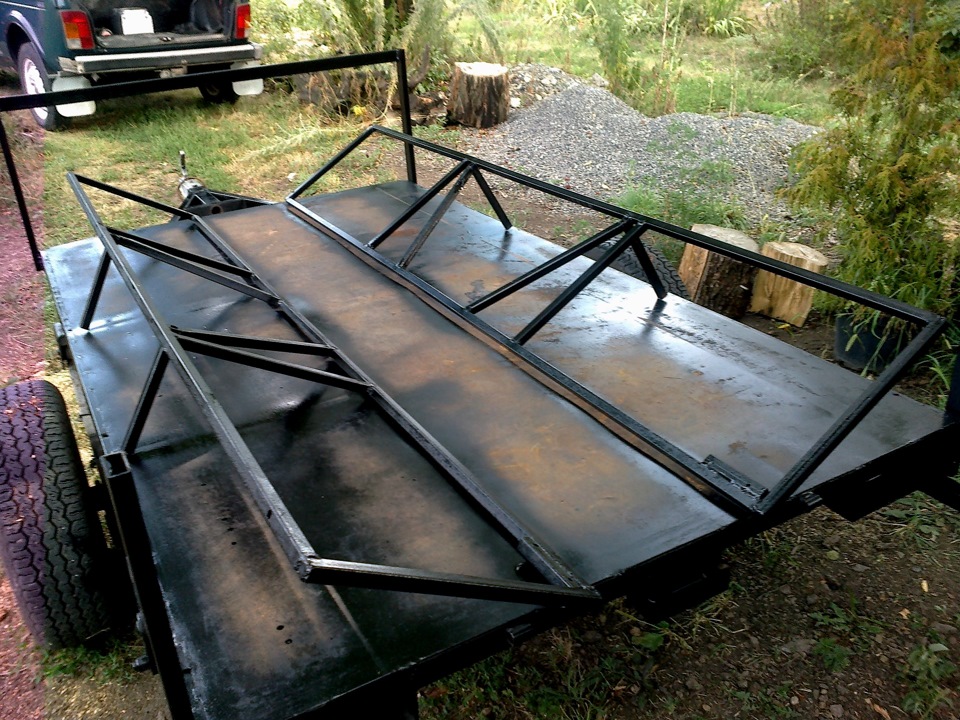 Обратите внимание на фотографию, на которой показано расположение поперечин квадратной трубы. Центральная перекладина находится на средней линии между двумя осями. Это должно быть на 18 дюймов позади центра платформы трейлера. Следующие два находятся далеко от центра под точками крепления пружинных подвесок. Еще один следует разместить посередине между опорой передней пружины и передней частью рамы. Сзади, 40 дюймов сзади было бы примерно правильно.