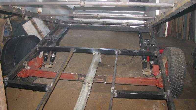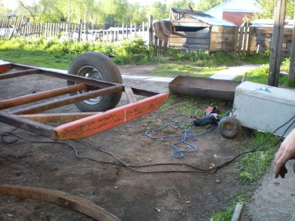 Подбирается по размеру, соответствующему его площади. - Ходовая часть. В ее качестве оптимально использовать передний мост, извлеченный из старой мотоколяски СЗД (инвалидка). Также часто устанавливаетсярессорная восьми листовая подвеска, которую крепят на резиновых втулках. По виду она схожа с автомобилем «Волга», но более облегченная. Рессоры крепят к балке моста стремянками, а под них подкладывают кобылки.