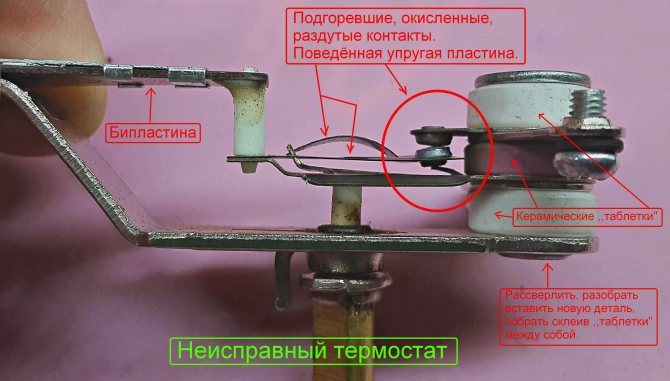 У него всего две функции – включение и выключение, что, как известно, не гарантирует точности настроек. Принцип работы биметаллического регулятора заключается в том, что встроенная пластина реагирует на температуру и при ее повышении изгибается, размыкая электрическую цепь. Обратный процесс происходит при ее остывании, она выпрямляется, и цепь снова замкнута.