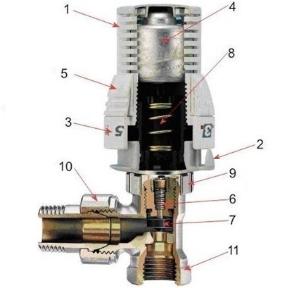 Радиаторный термостат работает благодаря двум главным составляющим: термостатической головке и клапану.