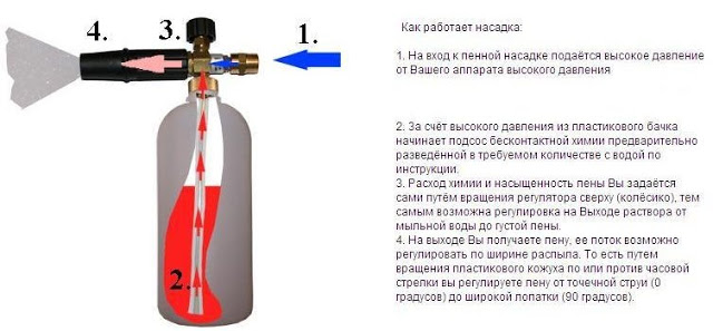 - После включения мойки в работу, вода под высоким давлением подается на пенообразователь, а оттуда – в емкость, заполненную моющим средством, где и происходит первичное пенообразование.