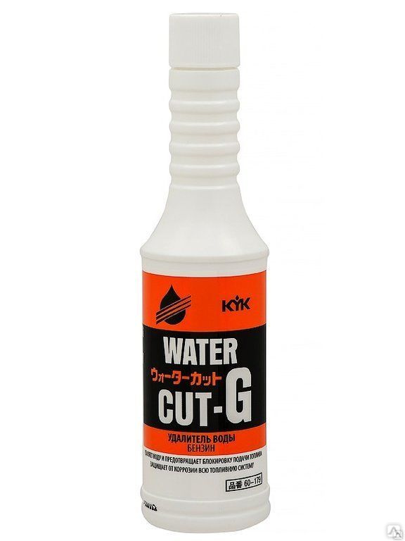 Присадка для бензиновых двигателей KYK WATER CUT — G удаляет воду из трубопровода для подачи топлива, предотвращает блокировку подачи топлива, благодаря вымораживанию воды, а так же коррозию деталей топливной системы.Способ применения: Перед заливкой топлива добавьте одну упаковку (180мл.