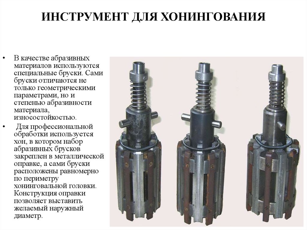 Дополнительно к станкам прилагаются инструменты – хонинговальные камни, флекс-хоны, головки, бруски, щетки для крацевания и щетки из абразивного нейлона. Они фиксируются на хоне и совершают вращательные и поступательно-возвратные движения.