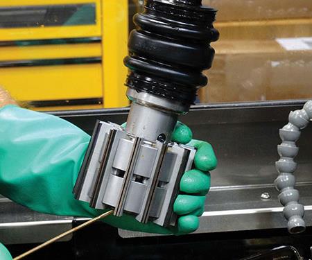 Зачистка и вальцовка, как следует из названия, фактически включают два процесса в одном инструменте. Конец трубы зажимается в станке, и инструмент продвигается внутрь. Охлаждающая жидкость прокачивается через внутренний диаметр трубки, обтекает инструмент и выталкивает стружку из передней части трубки во время работы.