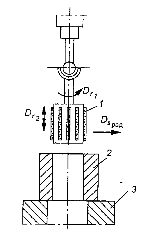 Рис. 1. Схема движений бруска и детали при хонннговании: 1 —деталь; 2 — брусок: 3 — перебег;
