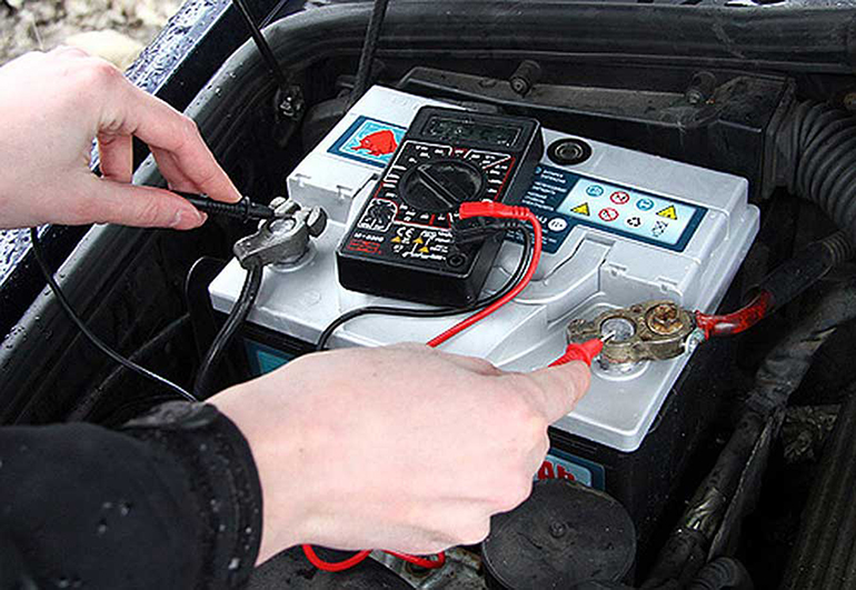 - Напряжение на клеммах. Оно должно быть не меньше 12,6 В. Если вольтметр показывает меньше 12 В, то батарея либо разряжена, либо неисправна.