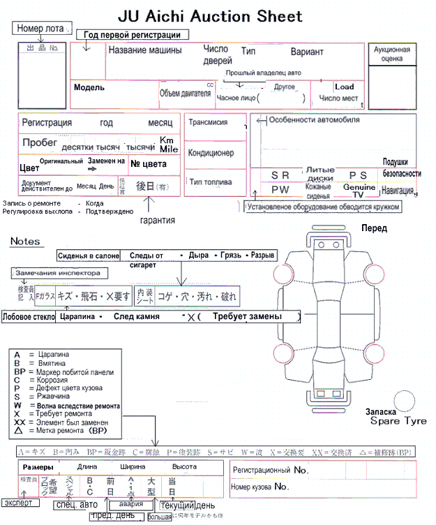 Они же выставляют оценку. Результаты своих наблюдений специалисты заносят в стандартный оценочный лист. Информация в оценочном документе зашифрована буквенными, цифровыми обозначениями, либо иероглифами. Также в листе изображена схема автомобиля, с помеченными дефектами. Но очень большое значение имеют детали описания. О нюансах инспектор делает соответствующие комментарии.