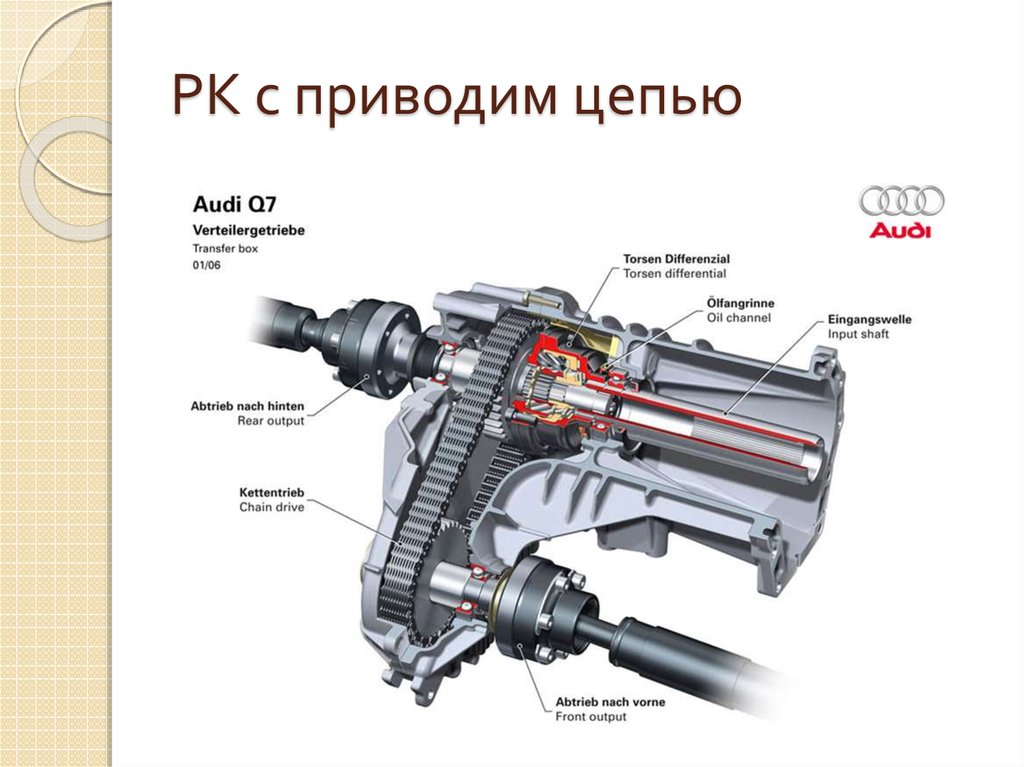 Помимо шестеренчатых раздаток на машинах применяются также и цепные. В них промежуточный вал отсутствует, а вращение на приводной вал второй оси осуществляется цепью. Такая конструкция отличается меньшей металлоемкостью узла, но и по надежности уступает шестеренчатому типу.