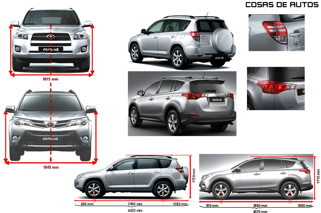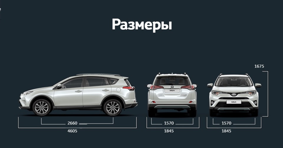 Габариты РАВ 4 четвертой генерации стали такими: длина – 4570 мм, ширина – 1845 мм, высота – 1670 мм, клиренс (дорожный просвет) – 197 мм.