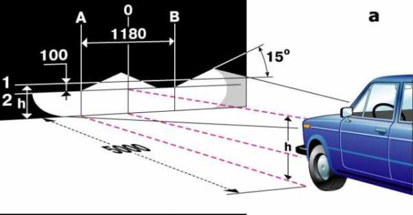 - между центрами пучка от левой и правой фары, при помощи винта, установить расстояние в 1270 мм (центр пучка находится на месте перехода горизонтальной границы в направленную галку),