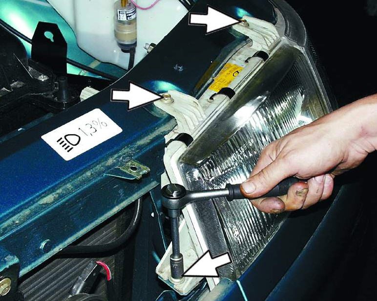- Отсоедините от фонаря всю проводку и снимите верхнюю часть решетки радиатора.Для этого необходимо открутить все болты ключом на «10».
