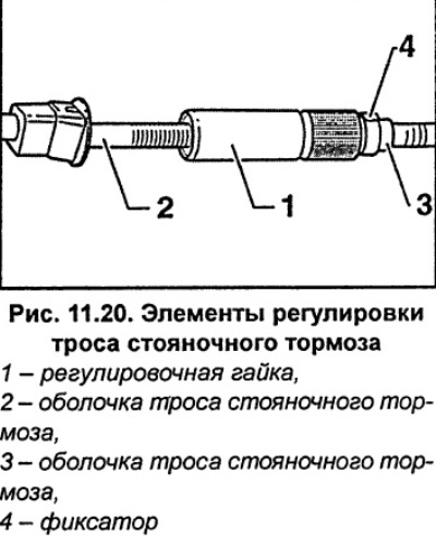 Сам трос не имеет возможности регулировки, но провисание в этой части системы должно быть устранено путем регулировки самих тормозных колодок — — с помощью звездообразного колеса.