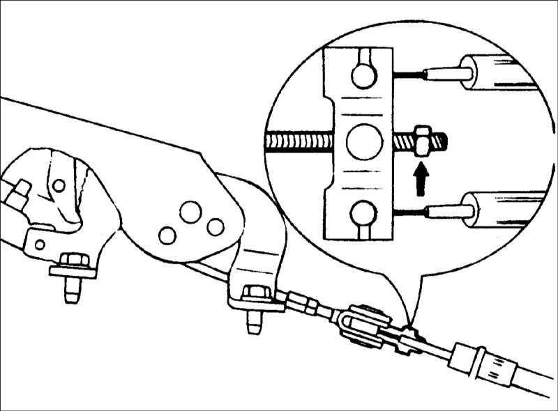 Если зазоры слишком велики, ослабьте регулировочные гайки троса с шагом 1/2 оборота до тех пор, пока зазор не станет правильным.