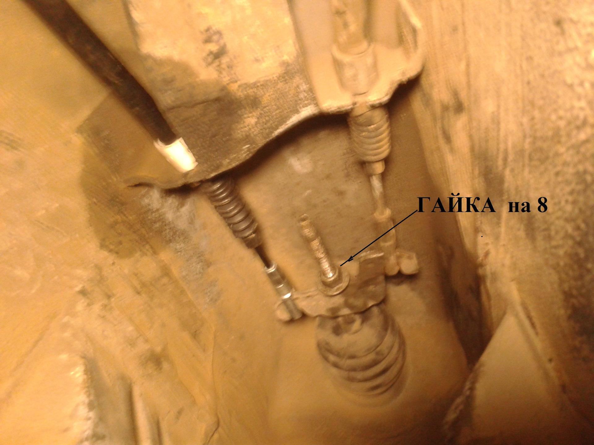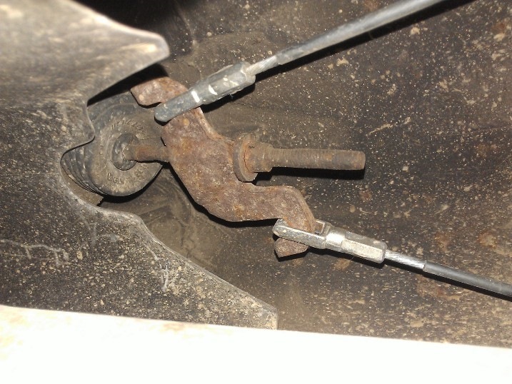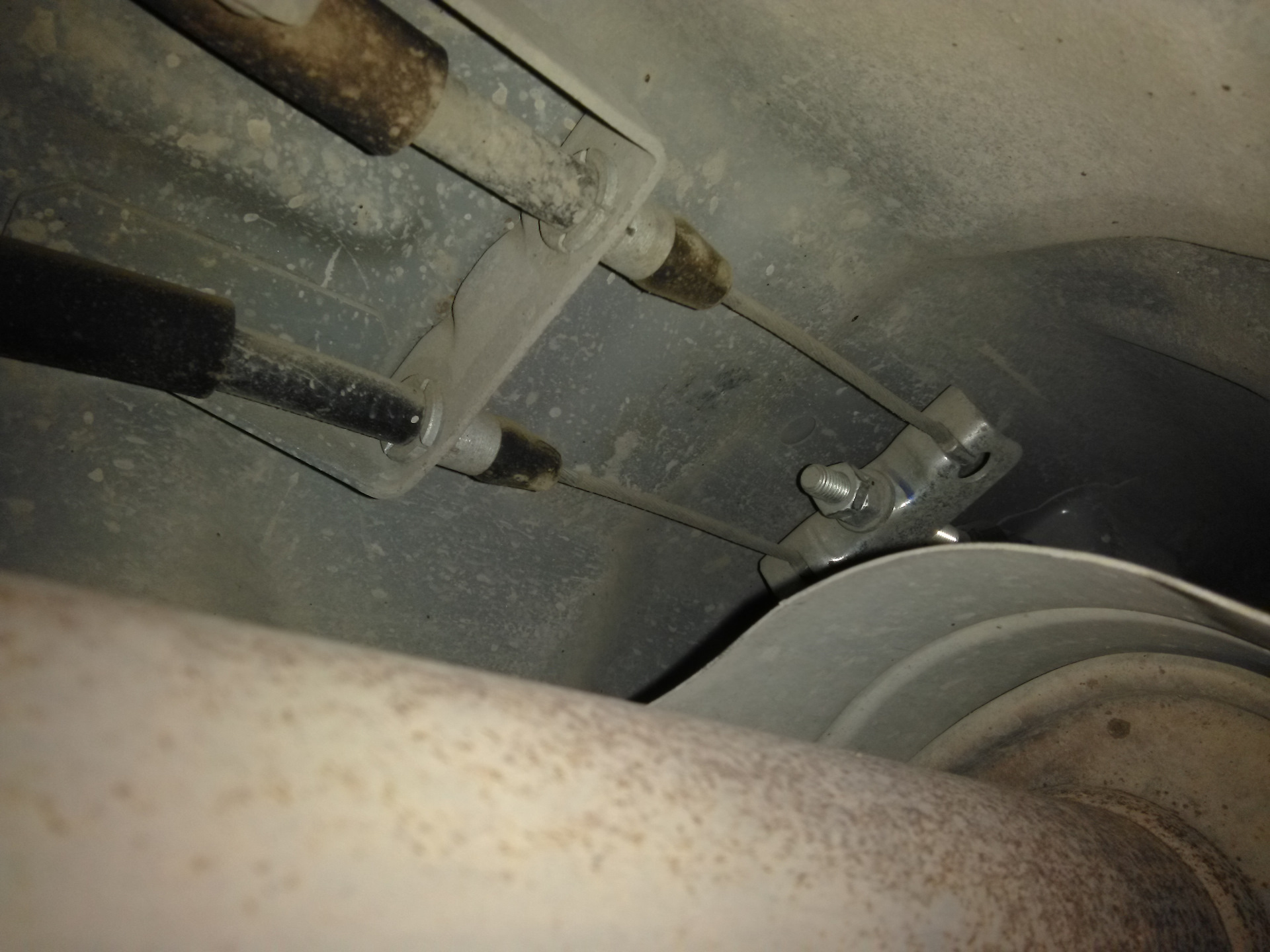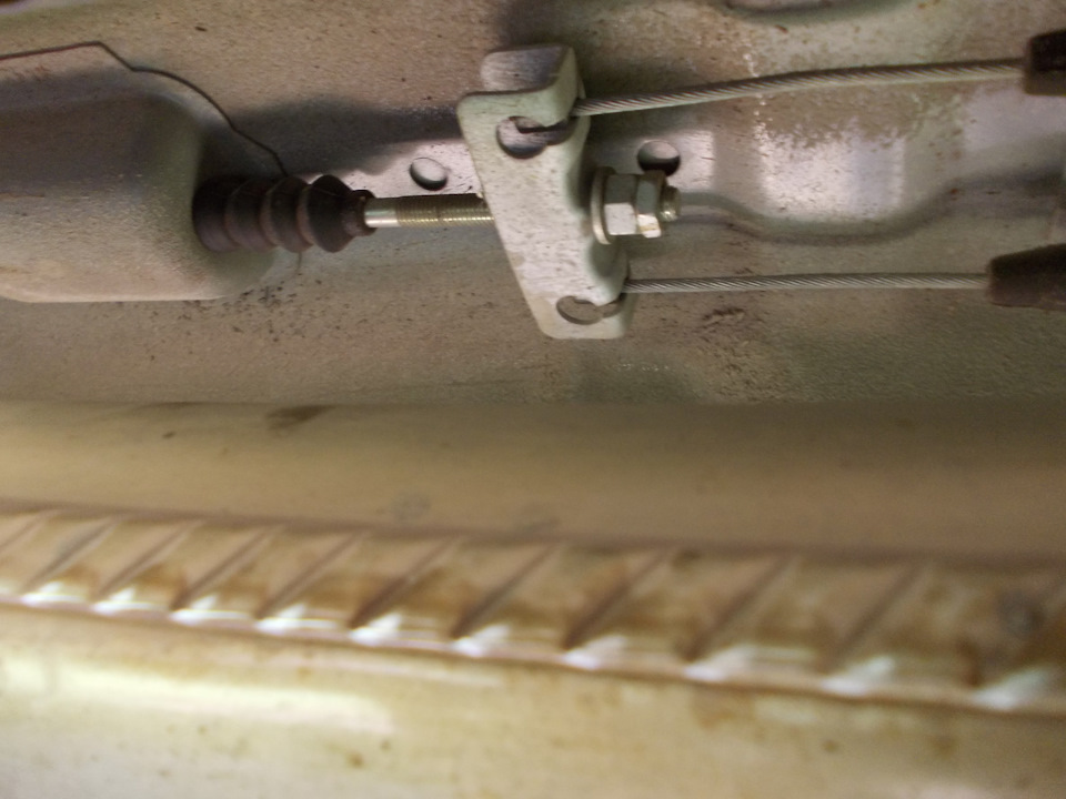 Перед вами троса ручного тормоза и регулировочная гайка на 13, прежде чем подтянуть ручник обратите внимание на троса ручника, как они подтянуты, не провисают ли они?