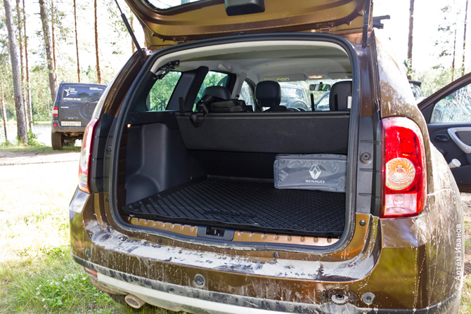 Существует разница в параметрах багажника Renault Duster у полноприводной и переднеприводной модификации. Это связано с наличием фальшпола для помещения запасного колеса, а также устройством трансмиссии для колес сзади.