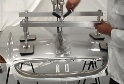 Серьезные вмятины не подлежат исправлению по этой технологии. Показана замена поврежденной части кузова из алюминия.