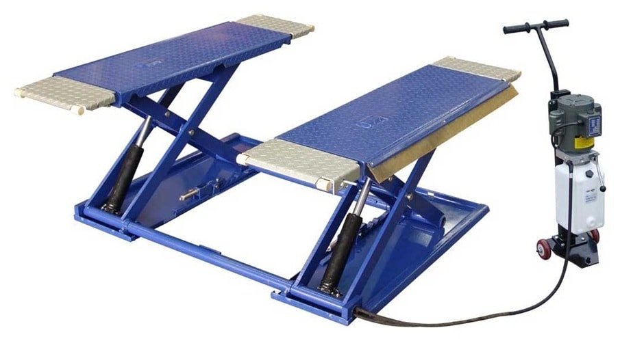 - Ножничные или параллелограммные автоподъемники состоят из двух горизонтальных трапов с закрепленными под ними шарнирными конструкциями. Автомобиль устанавливается на платформе. Последние поднимаются путем подтягивания конца одного из двух соединенных посредине элементов при помощи гидравлической или гидропневматической системы.