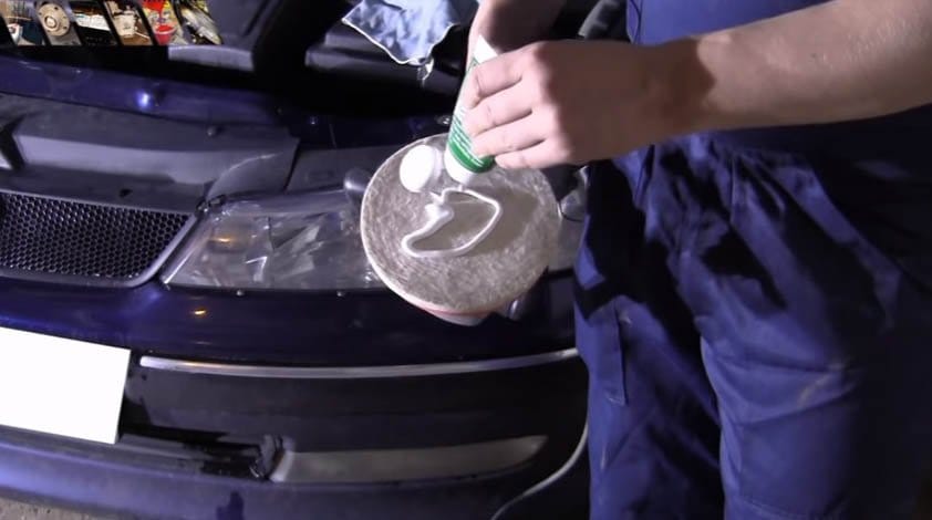 - Полировка фар с применением защитной и абразивной пасты. Для этого слоя пластика, который помутнел и повредился, аккуратно снимается в результате воздействия на него абразивной пасты.Это средство наносится на специальный круг, с помощью которого полируются ровные части фар.
