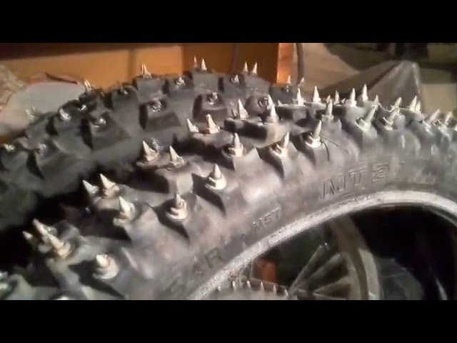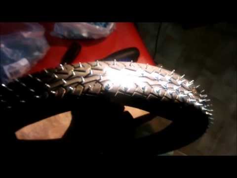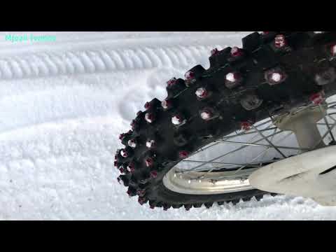 - Колеса моментально забиваются снегом, если трасса нечистая. В конце видео видно, что на редких шипах мотоцикл въехал в гору без проблем, а на частых сразу забуксовал.