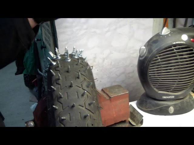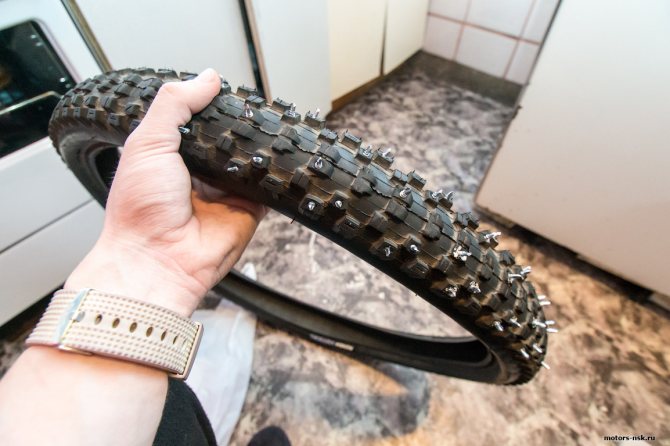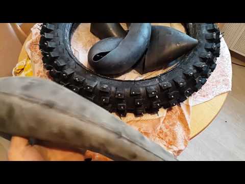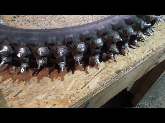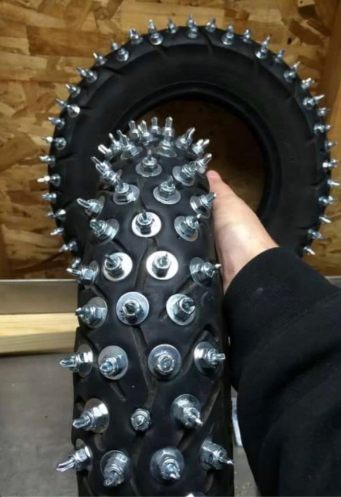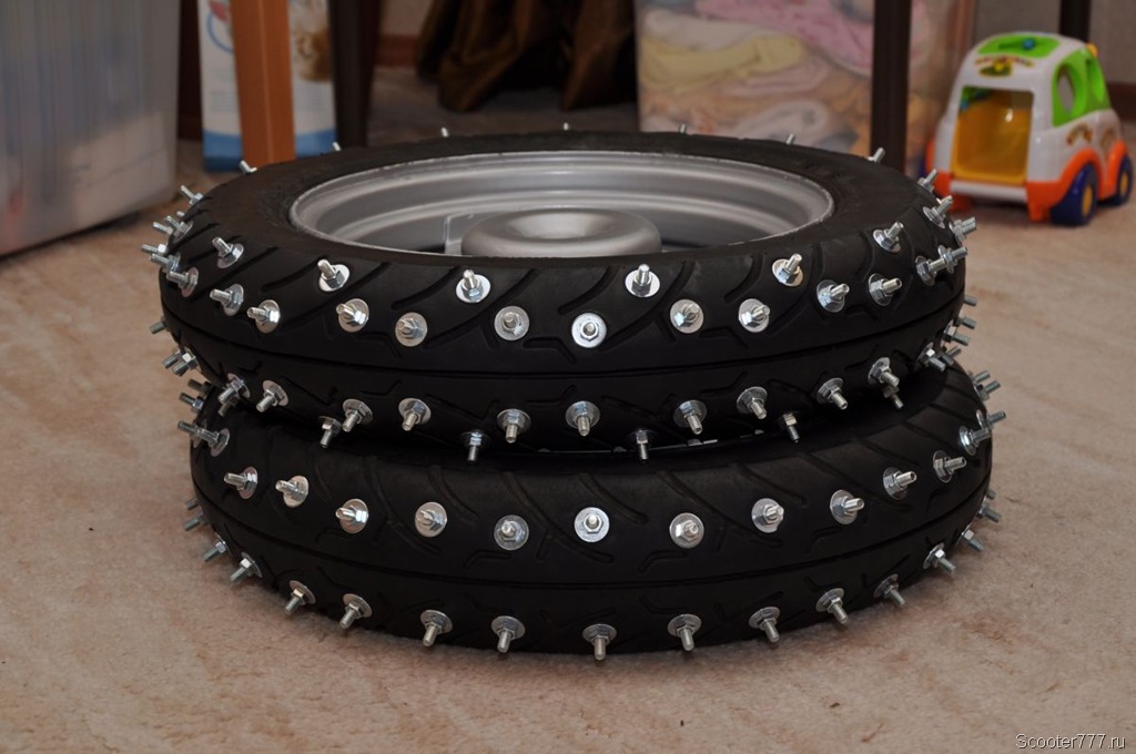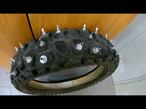 Шиповка I — шиповка частыми короткими саморезами. Многих смушает то, что саморезы вкручиваются без фиксации и могут вылететь. У нас ни одного самореза не вылетело, а мы сделали полтора десятка лунок, множество бернаутов и буксовали на земле до появления искр. Но при транспортировке следует быть осторожным. Первый раз мы перевозили мотоцикл на прицепе с упорной дугой для переднего колеса. Когда притягивали мотоцикл к дуге, вдавили пару саморезов внутрь покрышки — пришлось разбирать колесо.