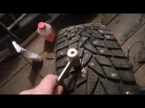 Можно делать это бытовой губкой, однако лучше применять пневматический распылитель, позволяющий раствору глубоко проникать во все отверстия. Шиповка зимних шин осуществляется максимально аккуратно — необходимо следить, чтобы не наблюдалось перекосов ни одного металлического предмета. Когда ровной установки добиться невозможно, шипы извлекаются плоскогубцами — при этом их необходимо раскачивать в разные стороны. Неровная установка с использованием пневматического пистолета может привести к разрыву посадочного гнезда — в таком случае оно просто пропускается, так как шип будет утерян уже через несколько километров.