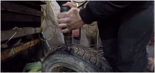 - Если шина не имеет заранее подготовленных технологических отверстий, то их следует сделать самостоятельно. Некоторые автовладельцы для этого используют шило. Контролировать глубину в таком случае крайне сложно. Есть риск повредить корд или проткнуть резину насквозь.