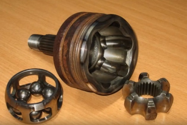 Такая конструкция предусматривает возможность менять углы ведущей полуоси относительно ведомой. Пребывая под постоянной динамической нагрузкой, сочленения корпус – шарики и кулак – шарики подвергаются износу. В результате между ними появляются зазоры. А они становятся причиной появления специфического шума, исходящего, как от надломленной ветки, то есть хруста. Исходят таковые от перекатывания шариков по выработанным или имеющим шероховатости, канавкам.