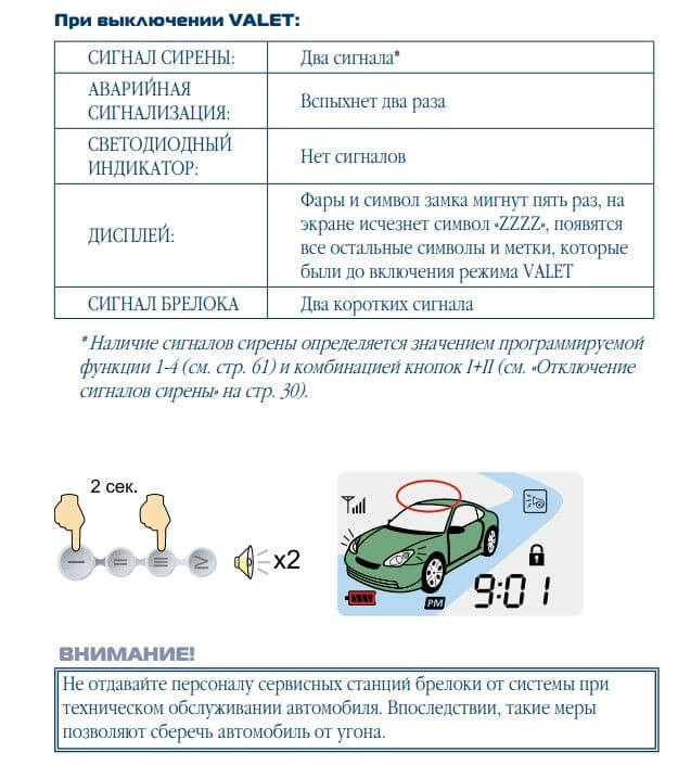 Если после шага 1 не будет предпринято никаких действий, то через 5 секунд. сигнализация мигнет 2 раза, STSTS перейдет из режима программирования брелока в режим VALET