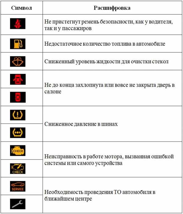 Расшифровка символов на приборной панели.