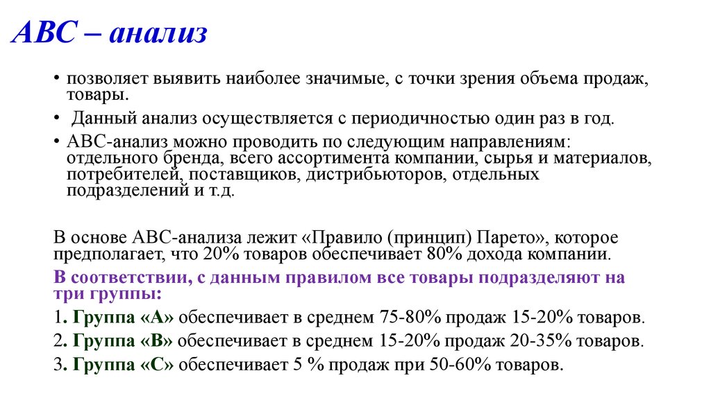 ABC-анализ базируется на принципе Парето (Вильфредо Парето, XIX век), сформулировавшего правило, суть которого сводится к следующему: контроль относительно небольшого количества элементов позволяет контролировать ситуацию в целом. Часто еще сформулированное Парето правило именуют правилом 80/20, что можно истолковать следующим образом: надежный контроль 20% номенклатурных позиций позволяет на 80% контролировать систему (т. е. запасы в нашем случае).