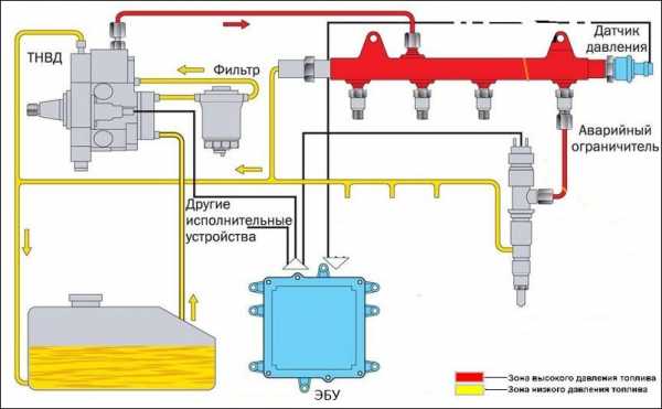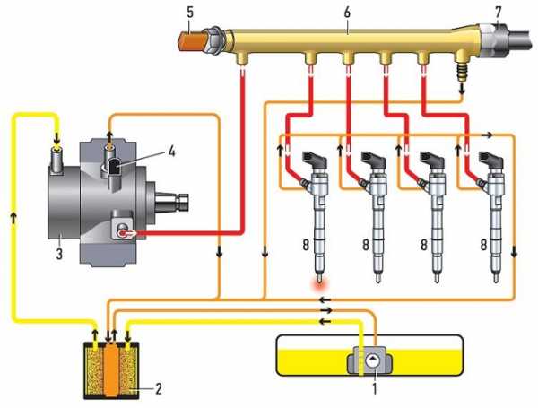 Желтым цветом показан контур низкого давления, красным – контур высокого давления, коричневым – обратный слив топлива в бак.