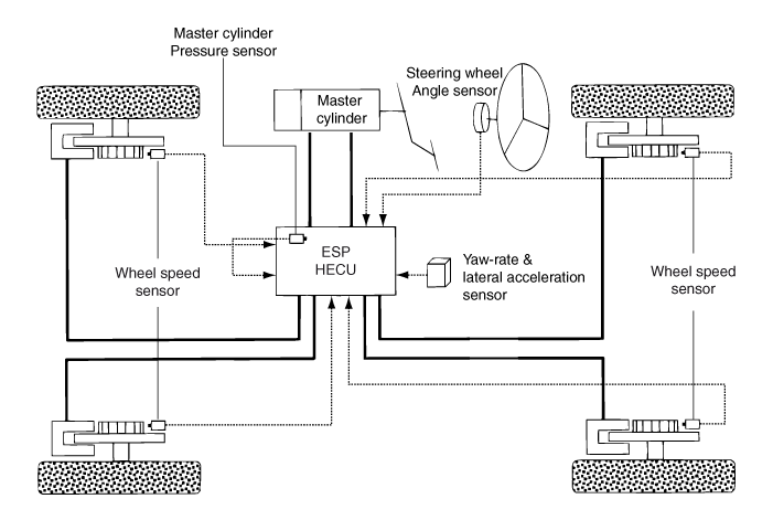 Для определения курса автомобиля ESP использует датчик положения руля. Воздействующие на машину силы отслеживает комбинированный датчик, который оценивает величину поворота вокруг вертикальной оси и поперечные перегрузки. Также ESP определяет скорость — общую и каждого колеса в отдельности — с помощью датчиков AБС. При несоответствии параметров, когда, например, машина не вписывается в вираж (руль повернут, а она движется по прямой), система вмешивается в управление.