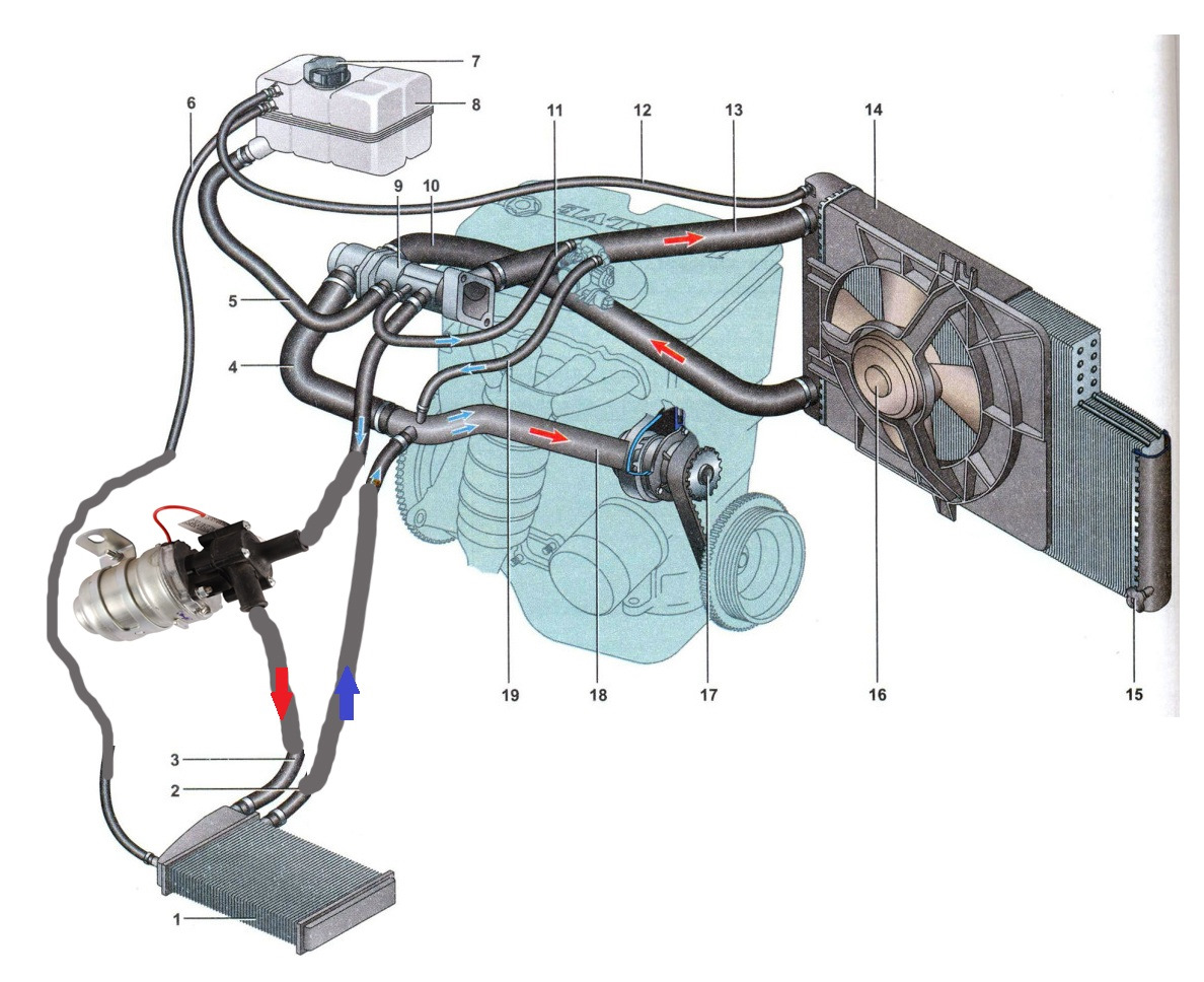 На работу обогревателя салона в значительной мере влияет система охлаждения силовой установки, поскольку она обеспечивает печку носителем тепла.