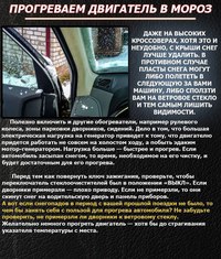 Зимний прогрев — отдельная история. Начинается она с пуска двигателя, и здесь есть маленький секрет. В сильный мороз не пытайтесь стартануть с первого раза. Дайте только провернуться коленвалу и примерно на третьем обороте выключите зажигание. Так Вы, во-первых, «оживите» застывший на морозе аккумулятор, во-вторых, хоть немного поднимете масло из картера в мотор. Секунд через 10 пробуйте заводить машину, выжав сцепление.