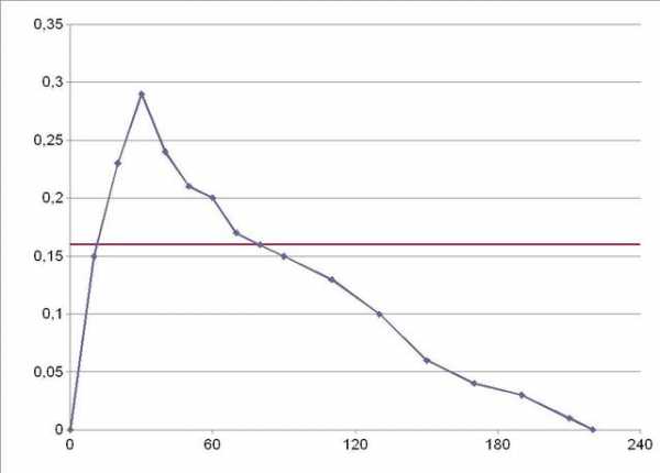 Нашим подопытным был молодой человек возрастом 30 лет, весом 74 кг. Каждые 10 минут он дышал в трубочку алкотестера, чтобы наблюдать динамику изменения промиллей в крови. Делаем выводы, что максимальное количество промиллей в крови приходится на первые 30-40 минут после употребления 250 гр шампанского.