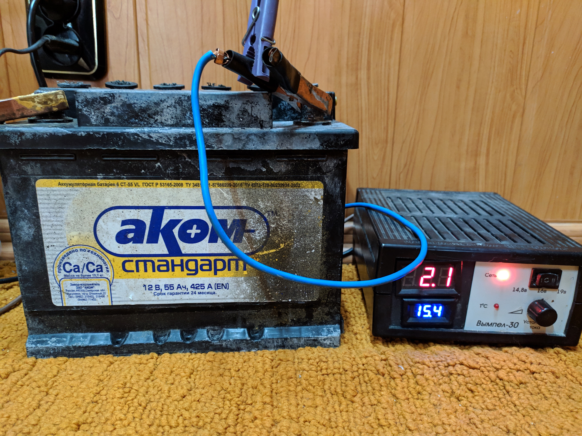 Процесс зарядки старых кислотных аккумуляторов контролируется поведением электролита. Если он закипел, то зарядку следует прекратить через 10–15 минут, после этого проверяется напряжение на клеммах.