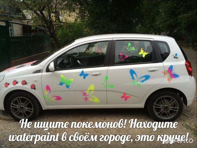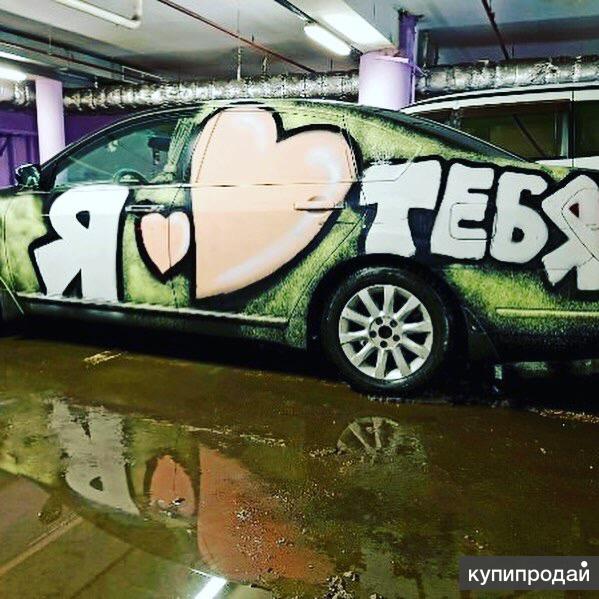 Также возможно создавать рекламные объявление на стекле автомобиля, или по бокам, такие яркие надписи отлично привлекают внимание.