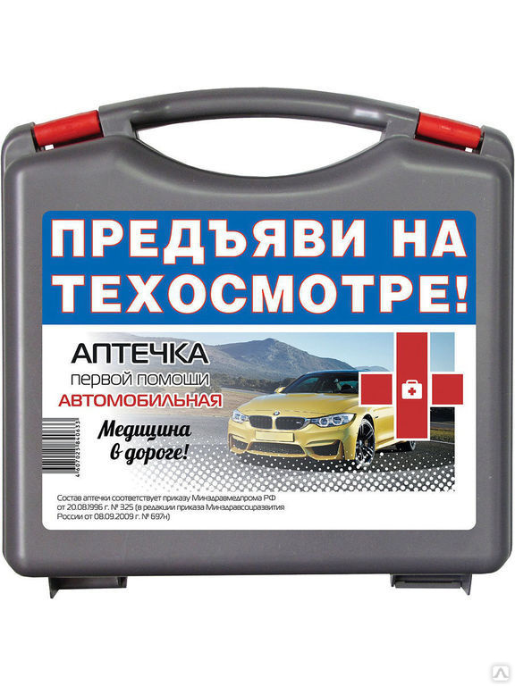 В настоящее время действующее законодательство Российской Федерации обуславливает необходимость нахождения аптечки в автомобиле. Приказ Министерства здравоохранения и медицинской промышленности Российской Федерации «Об утверждении состава и рекомендаций по применению аптечки первой помощи (автомобильной)» № 325 от 20.08.1996, в редакции приказа Минздравсоцразвития России № 697н от 08.09.2009 г., определяет состав автомобильной аптечки. Состав аптечки: 1. Средства для временной остановки наружного кровотечения и перевязки ран Жгут кровоостанавливающий — 1 шт. Бинт марлевый медицинский нестерильный (5 м х 5 см) — 2 шт. Бинт марлевый медицинский нестерильный (5 м х 10 см) — 2 шт. Бинт марлевый медицинский нестерильный (7 м х 14 см) — 1 шт. Бинт марлевый медицинский стерильный (5 м х 7 см) — 2 шт. Бинт марлевый медицинский стерильный (5 м х 10 см) — 2 шт. Бинт марлевый медицинский стерильный (7 м х 14 см) — 1 шт. Пакет перевязочный стерильный — 1 шт. Салфетки марлевые медицинские стерильные (не менее 16 х14см №10) — 1 уп. Лейкопластырь бактерицидный (не менее 4 см х 10 см) — 2 шт. Лейкопластырь бактерицидный (не менее 1,9 см х 7,2 см) — 10 шт. Лейкопластырь рулонный (не менее 1 см х 250 см) — 1 шт. 2. Средства для сердечно-легочной реанимации Устройство для проведения искусственного дыхания «Рот-Устройство-Рот» — 1 шт. 3. Прочие средства Ножницы — 1 шт. Перчатки медицинские (размер не менее М) — 1 пара. Рекомендации по применению аптечки первой помощи (автомобильной) — 1 шт. Футляр — 1 шт.