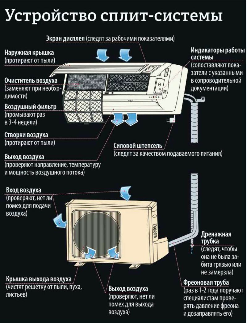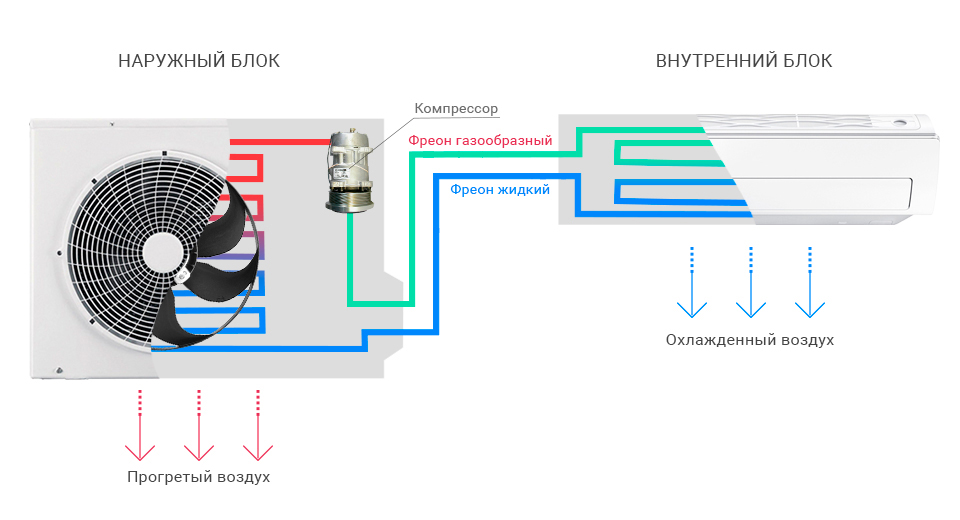 В основе работы устройства находится способность впитывать в себя тепло при испарении и выводить его при конденсации. Рассмотрим более наглядно, как происходит эта процедура в сплит – системе.