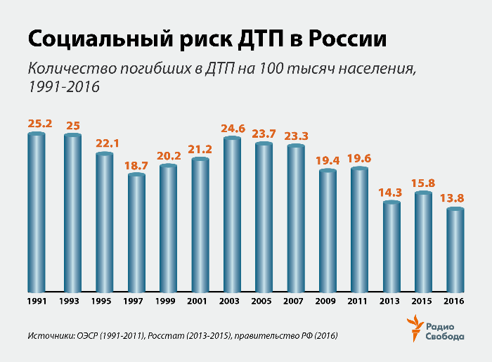 Смертность от ДТП в 2015 г. — 15,8 на 100 тыс. населения. Для сравнения, в 2005 г. этот показатель составлял 23,6 на 100 тыс. человек.