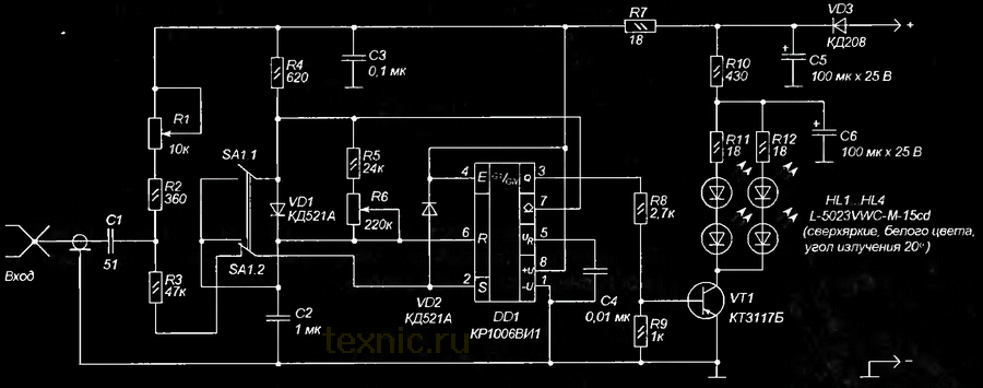 Далее с выхода 6 микросхемы DD1 импульсы, синхронизированные с зажиганием автомобиля, поступают на базу транзистора VT2, который работает в режиме ключа. В результате чего через группу сверхярких светодиодов протекает импульсный ток порядка 0,4А. Для светодиодов такая большая величина тока не страшна, поскольку длительность этих импульсов очень мала.