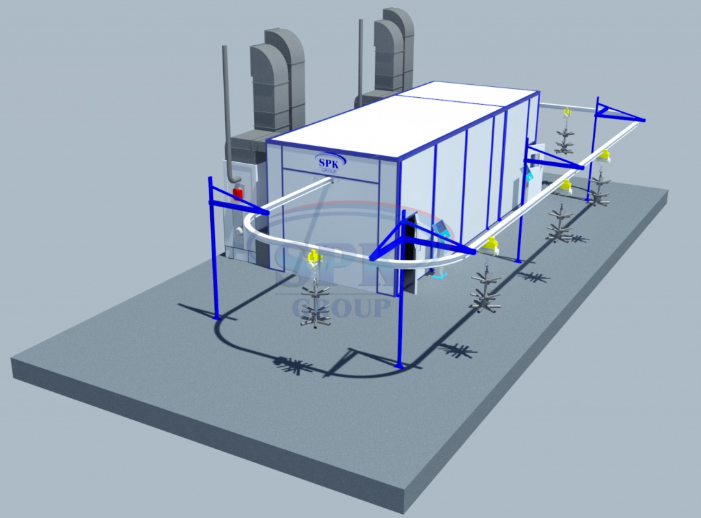 Воздух течет сверху вниз равномерно, огибая окрашиваемое изделие. Частицы краски могут задерживать напольные фильтры под решетками. Воздух нагревается лишь при работе вентиляционной системы. При отключении системы нагрев прекращается.