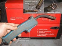- Устанавливают в аппарат катушку сокой проволоки. Свободный конец вводят в подающий механизм. Надеются на проволоку, наконечник, возвращают сопло на место.