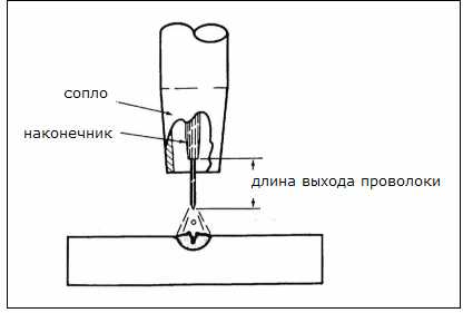 До касания свариваемого металла проволока должна выступать из наконечника на определённую длину.