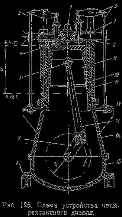 На рис. 125 показана схема устройства четырехтактного дизеля. Фундаментная рама 15 дизеля покоится на судовом фундаменте 1. Блок цилиндров 11 закрепляется на станине двигателя 14. Поршень 9 под действием газов совершает возвратно-поступательное движение по зеркалу цилиндровой втулки 10 и с помощью шатуна 13 вращает коленчатый вал 2. Верхняя головка шатуна с помощью поршневого пальца 3 соединена с поршнем, а нижняя охватывает мотылевую шейку коленчатого вала. В крышке 7 цилиндра размещены впускной клапан 4, выпускной клапан 8 и топливная форсунка 6. Впускной и выпускной клапаны приводятся в действие через систему штанг и рычагов 5 от кулачных шайб распределительных валов 12. Последние получают вращение от коленчатого вала.