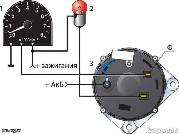 Схема включения тахометра на современной «Волге»: 1 – тахометр; 2 – контрольная лампа генератора; 3 – генератор; ф – фазовый вывод (на тахометр).