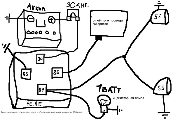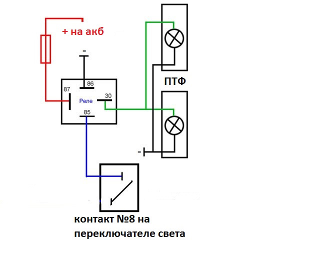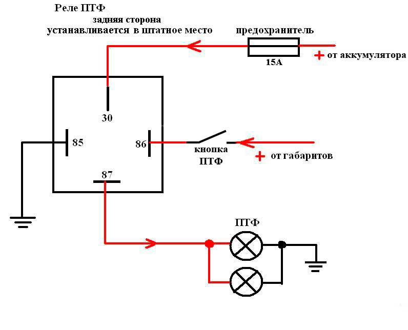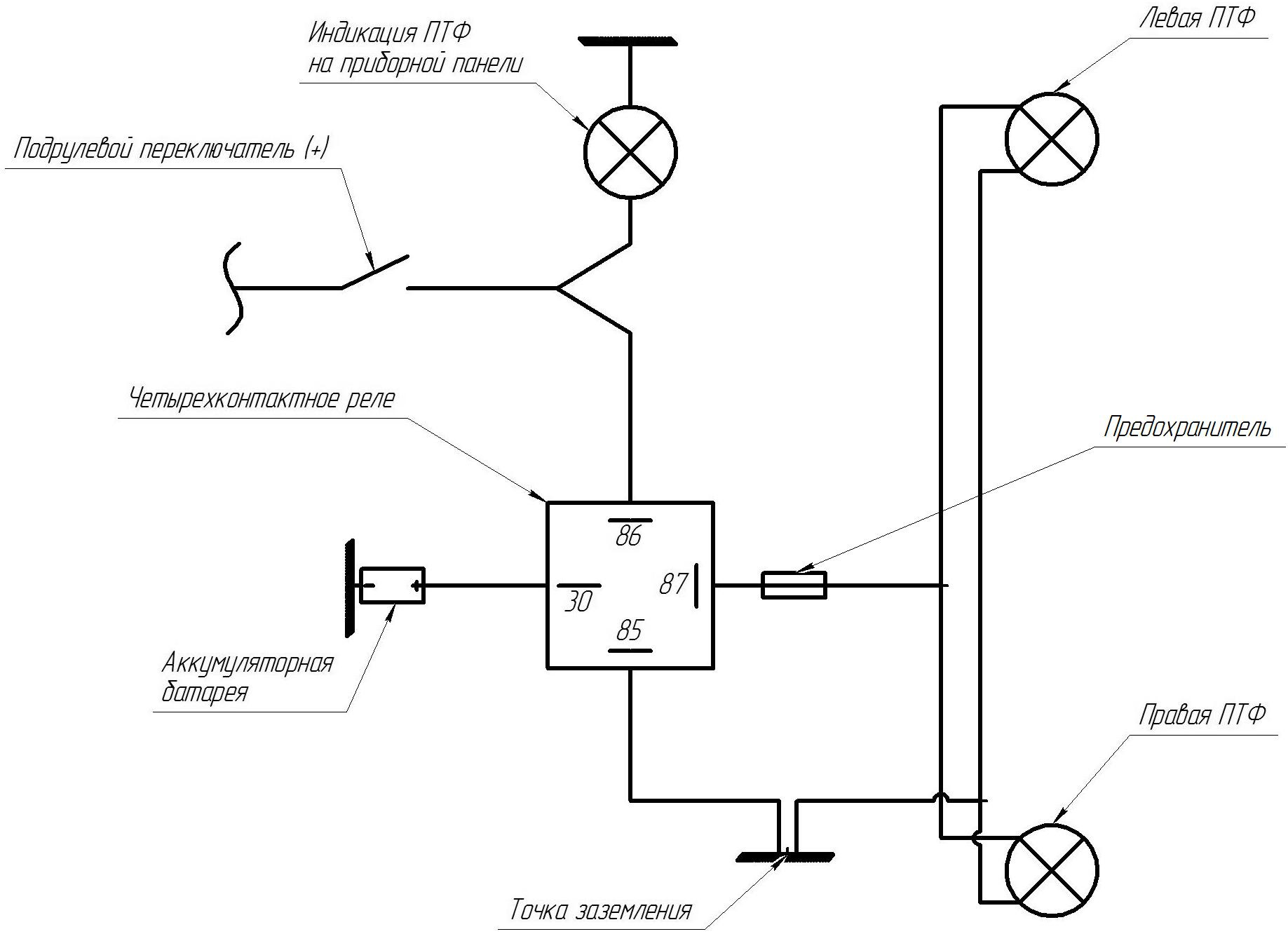 Когда на катушку реле подано напряжение (12 В + от переключателя дальнего света к клемме 86, масса на клемме 85), нормально замкнутые контакты размыкаются, прерывая 12 В + к противотуманным фарам. Клемма 87 не используется.
